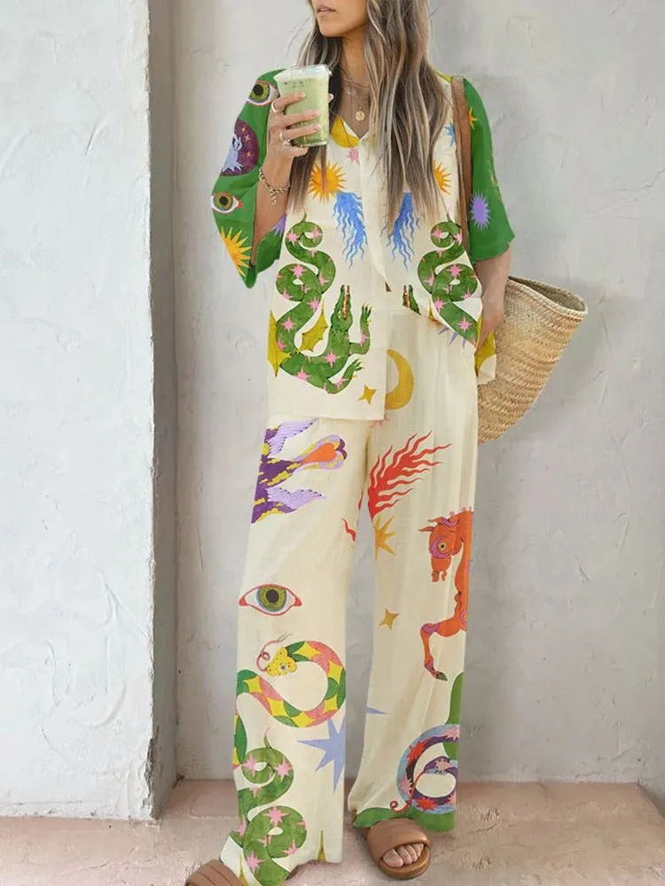 Adéntrate en la originalidad y el arte con nuestro conjunto. Este conjunto, conformado por un pantalón y una camisa con un estampado artístico único, te invita a expresarte de manera creativa a través de la moda. Cada detalle ha sido minuciosamente diseñado para que te sientas como una obra de arte en movimiento. La armoniosa combinación de estas dos piezas no solo te hace lucir espectacular, sino que también te conecta con una experiencia emocional única, donde tu personalidad brilla con fuerza.