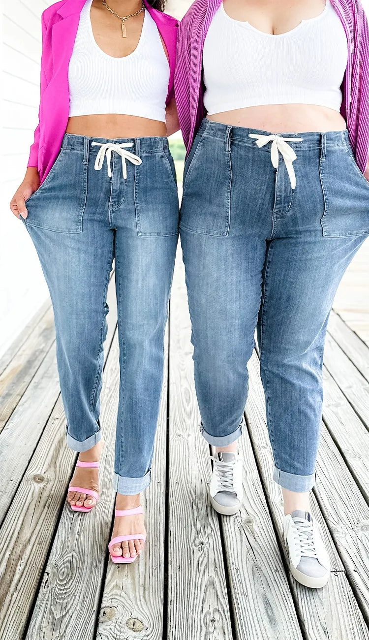 Los Pantalones de Mezclilla Melissa™ Estilo Jogger son mucho más que unos simples joggers vaqueros. Con su increíble elasticidad, cintura elástica, dobladillo interior flexible y bolsillos profundos, ofrecen una experiencia de uso inigualable.