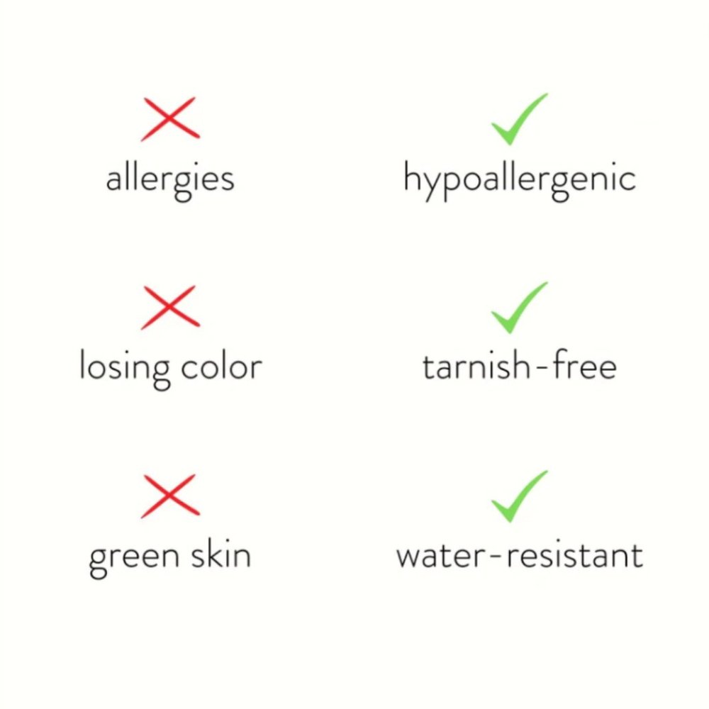 Fabricado en acero inoxidable resistente al agua, nunca más tendrás que preocuparte por dedos verdes, joyas que se desvanecen o que se empañan.